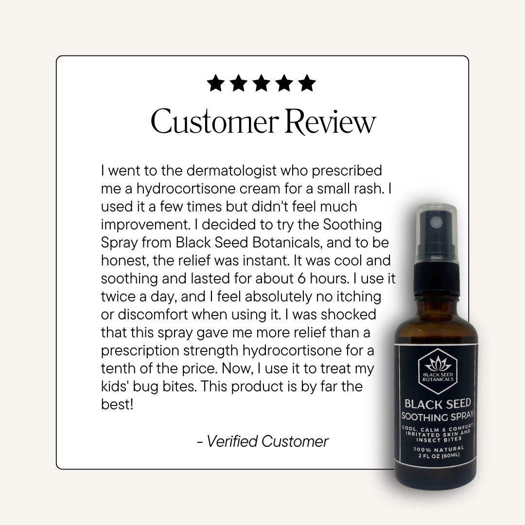 Formulated with nature's most effective skin-calming ingredients including Black Seed Oil, Witch Hazel, and Aloe Vera Gel, this 100% natural spray cools on contact and helps accelerate healing without relying on harsh chemicals or artificial additives.